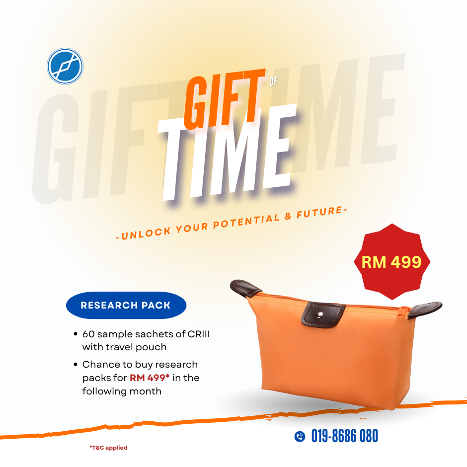 Introducing the Gift of Time Research Pack—a luxurious selection guaranteed to elevate your healthcare routine. This exclusive bundle features 60 sample sachets of the revolutionary CRIII, all conveniently housed in a stylish travel pouch. For a limited time, priced at just RM 499, you'll also unlock an exclusive opportunity to purchase additional research packs for only RM 499 next month. Invite only offer. Don't miss out on this exclusive deal! Terms and conditions apply. Each sample sachet contains 2g of product, and the travel pouch is available in sleek black or elegant beige to complement your style!